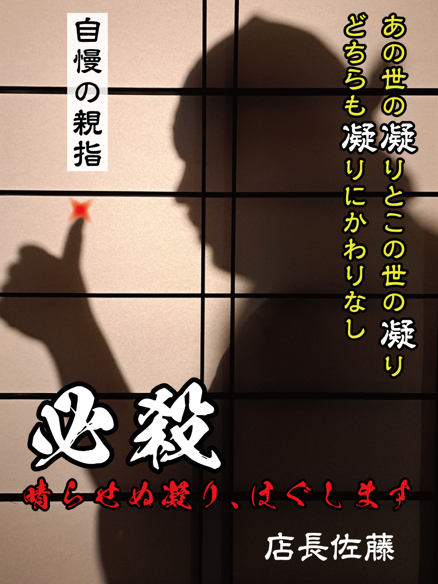 ご町内の皆様、大変お騒がせしております。ひとつぼぉしでございます!(^^)!【必殺】、それはほぐしの念を意味する。当店は町のパワースポットとなれるよう、日々お客様が抱える頑固な疲れに、自慢の手技を屈して対応しております。うつ伏せだけではなく、横向きや仰向け、ストレッチなどでの施術も対応致しますので、他店とはひと味違う、深い眠りを誘う施術を是非ご体感下さい!